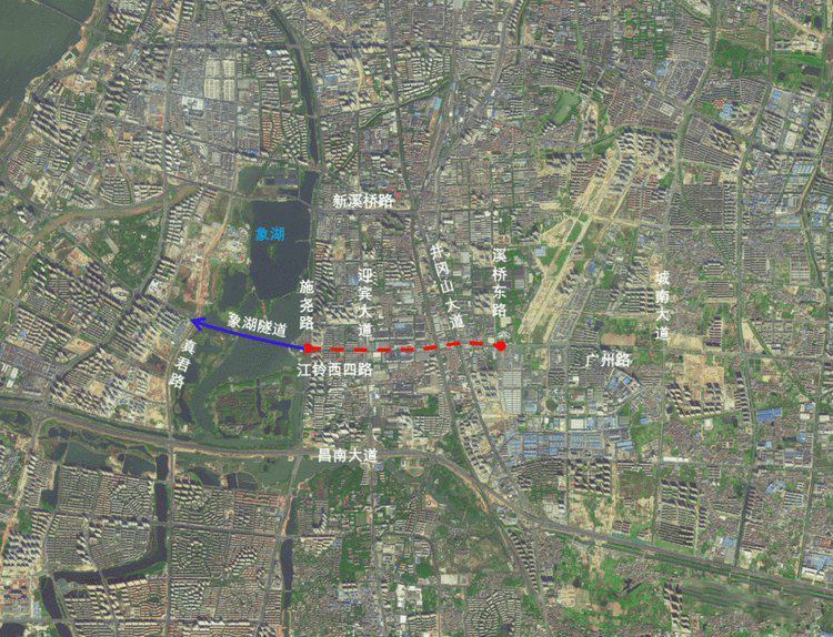 据了解,象湖隧道东延项目位于九洲大街-广州路中段,是连通象湖隧道、跨越京九铁路的关键路段。本次规划西起象湖隧道东出口,东至溪桥东路,规划道路宽50- -72米,全长约2. 5km,定位为城市主干路。
