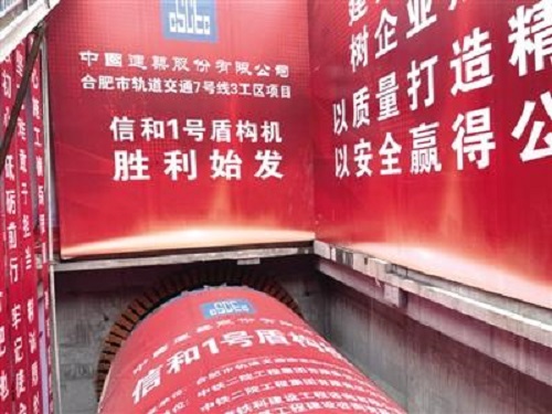 核心提示:随着始发令的下达,“信和1号”盾构刀盘缓缓转动,身着红装的盾构机整体缓缓向前掘进,合肥市轨道交通7号线首台盾构机在中建五局安徽公司承建的三工区天津路站顺利始发。