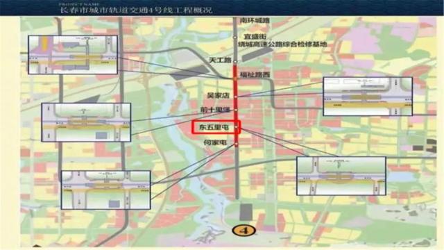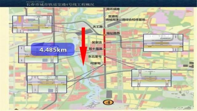 长春轨道交通4号线南延工程线路全长4.485km,沿临河街向南敷设,车站为路中单层高架侧式车站,线路全部为高架形式,采用与既有4号线相同制式系统。共设5站6区间,5座车站分别是福祉路西站、吴家店站、前十里堡站、东五里屯站、何家屯站,平均站间距864米,其中福祉路西站与轨道交通6号线换乘。