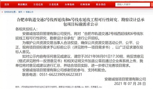 近日,从合肥市公共资源交易中心获悉,合肥市轨道交通2号线西延线工程可行性研究及勘察设计总承包项目恢复进行,与此同时,6号线东延线工程可行性研究、勘察设计总承包项目也同步进行。