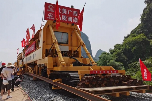 当天上午10点,在崇左市扶绥县渠黎镇渠嘟咘1号大桥桥头,随着作业人员操作CPG500型铺轨机组,成功铺设首对500米长钢轨,标志着南崇铁路铺轨施工正式拉开序幕。