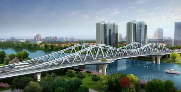 该桥结合昆山市青阳港滨水城市中心规划,以飘逸柔美的昆曲水袖为意象,采用钢桁架组合结构打造出桥梁的主体。至柔的桥梁造型与至刚的桥梁结构,完美地融合在金浦大桥中,一桥飞跨南北,瞬间将青阳港航道妆点成了画。