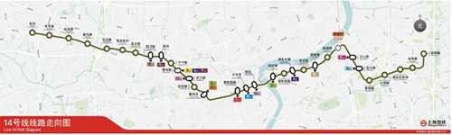 14号线西起嘉定封浜东至浦东金桥,贯穿上海城区市中心,途经嘉定区、普陀区、静安区、黄浦区和浦东新区,正线全长约38.5公里,共设地下车站31座,可与轨道交通网络中其他13条轨道交通线路换乘。