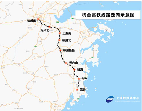 杭台高铁是国家沿海铁路快速客运通道的重要组成部分,连接杭州、绍兴、台州三地,北起杭州东站,利用杭甬高铁至绍兴北站,之后新建正线至台州市温岭站,设计时速350公里,线路全长约266.9公里,其中新建线路约226.3公里,设绍兴北、上虞南、嵊州北、嵊州新昌、天台山、临海、台州、温岭8个车站。