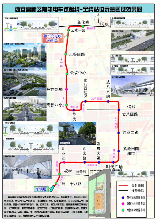根据前期规划,西安高新区有轨电车试验线北起鱼化寨、南至杨家湾纬二十八路,全长约17.2公里,均为高架线,共设车站18座、车辆场1座,平均站间距为997米。