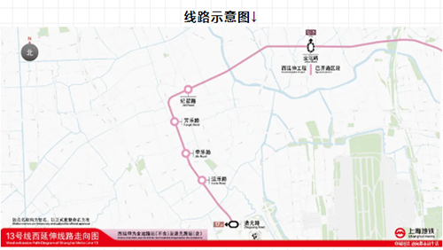 13号线西延伸线路起自13号线已建金运路站,终于诸光路站,主要沿金沙江路-纪宏路-联友路-金丰路-诸光路走行,线路总长度约9.6公里。