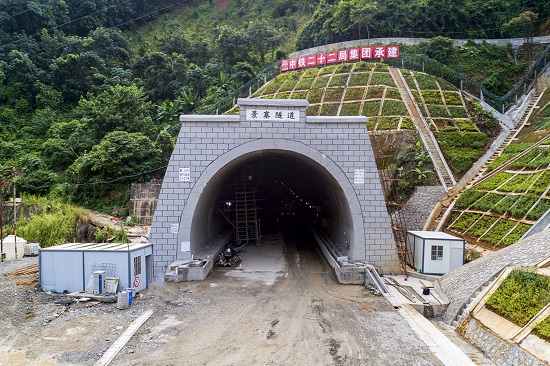 景寨隧道全长9.5公里,为时速160公里的单线隧道,也是全线最后一个攻克的“堡垒”。建成开通后火车仅需4分钟通过,建设者却在此坚守奋斗了1700多个日夜。