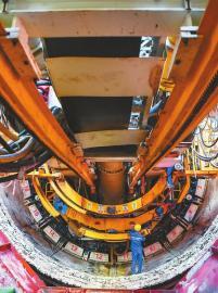 盾构机从岷江右岸始发,下穿民房、绕城高速、岷江后,从一个直径22.4米、深度113.5米的超深大直径竖井内拆解退场,这也是全国水利项目目前最深的大直径超深接收竖井。