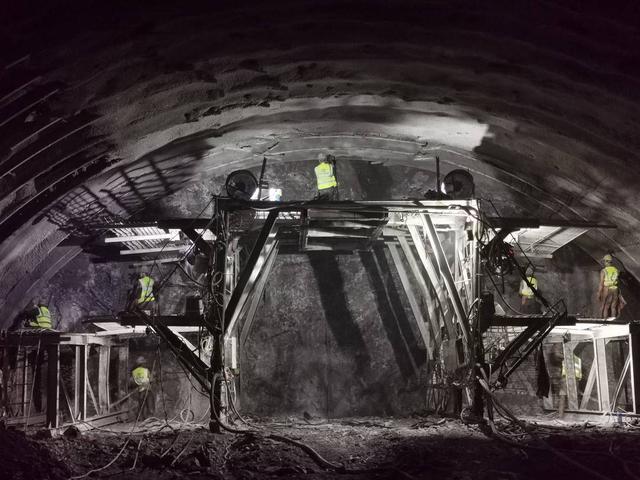 面对种种困难,建设者在隧道施工中严格执行“短进尺、弱扰动、强支护、快封闭、勤测量”原则。岩爆处治方面采取台阶法施工、超前水平释压孔、高压喷水等措施,降低岩爆发生概率;采用超前支护、喷射反压混凝土、变更加强初支结构参数等措施抵抗岩爆释放强度,同时工人采取防爆服、防爆面罩等防护措施保护人身安全。