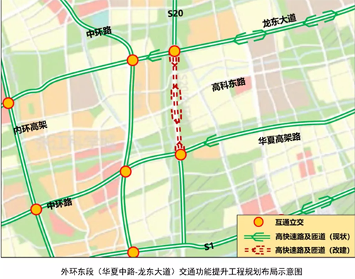 外环主线:将外环东段(华夏中路-龙东大道)进行抬升,形成高架主线道路。