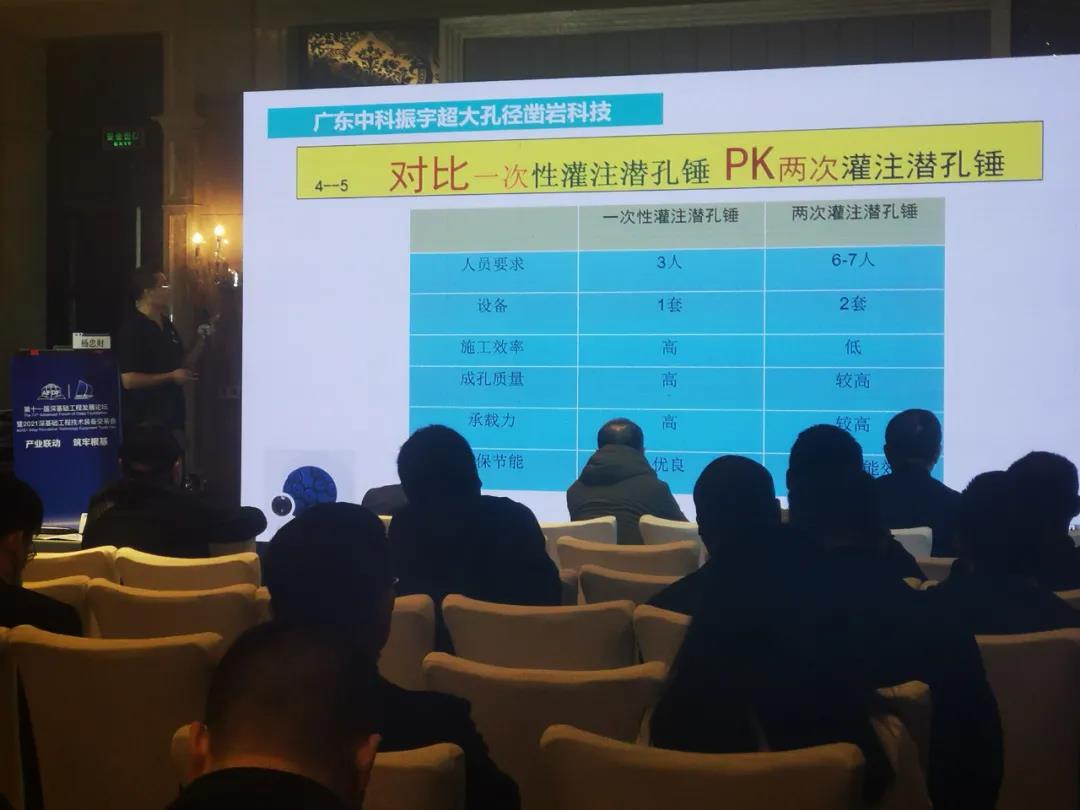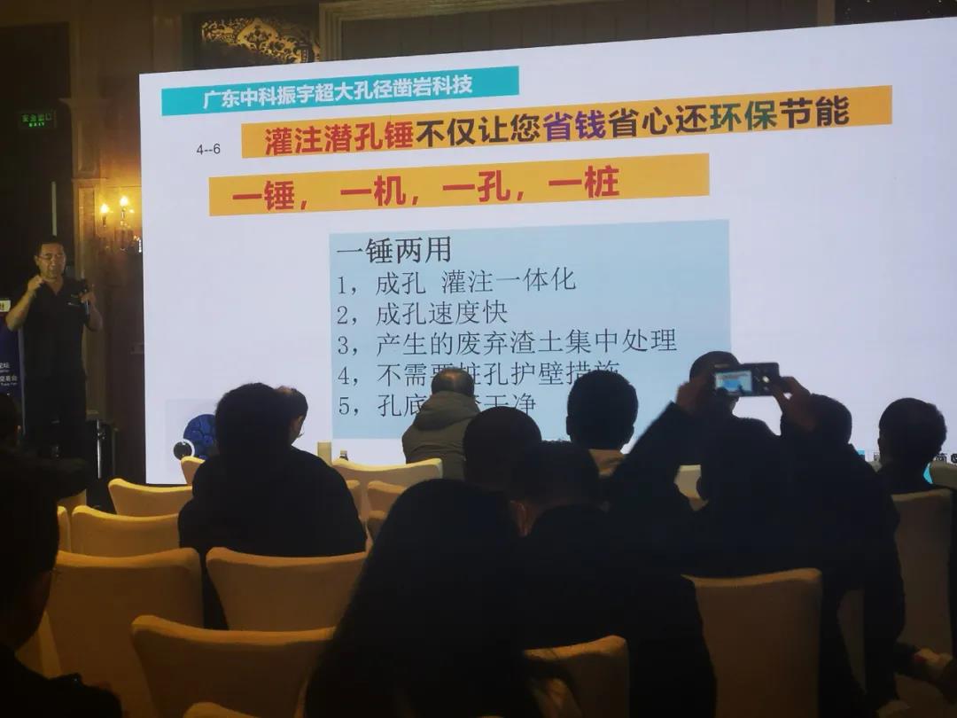 作为协办单位之一,广东中科振宇机械有限公司,广东中科振宇潜孔锤凿岩科技以《一锤二用,潜孔锤凿岩灌注成桩,中科振宇又一创新科技》为主题作了专题报告,其中灌注潜孔锤创新技术应用于基础施工案例分享引起了与会者极大兴趣。节省人力,节省设备投入,节省能量材料消耗等,在节能环保碳达峰目标的今天,有着深刻意义和深远影响。