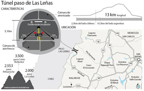 据悉,连接智利和阿根廷、耗资 16 亿美元的 Las Lenas 隧道的可行性研究已近完成。