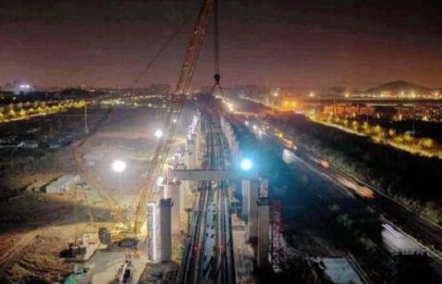 11月11日凌晨0时整,随着现场指挥人员一声令下,南沿江城际铁路上跨宁杭高铁上行联络线27号墩钢横梁开始吊装施工,标志着南沿江城际铁路全线上跨运营高铁钢横梁数量最多的吊装施工正式拉开序幕,这也是该线路南京段首片门式墩钢横梁吊装。