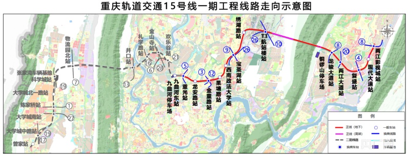 据悉,重庆轨道交通15号线是横向联系三大槽谷北部的东西向城轨快线,其中15号线一期工程起点为九曲河东站,终点为两江影视城站,主要沿金州大道、金果大道、宝圣大道、机场路、双龙大道、天佑路、金御大道敷设,线路全长38.7km,设站14座,均为地下站,换乘站7座,平均站间距2.96km,是国内目前落地的首个时速140公里市域快线项目。