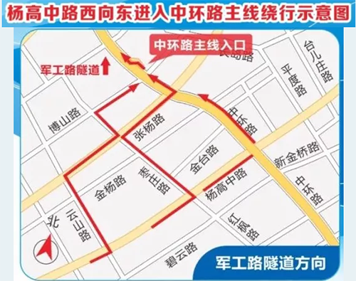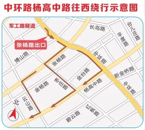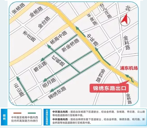 施工期间原途经下匝道驶出中环车辆需通过中环张杨路出口或锦绣东路出口,途经金桥路、张杨路、枣庄路、云山路、明月路、新金桥路、锦绣东路、红枫路等地面道路进行绕行。原途经上匝道进入中环车辆需途经金桥路、张杨路、枣庄路、云山路、锦绣东路、红枫路等地面道路绕行至中环张杨路入口或锦绣东路入口进入中环。