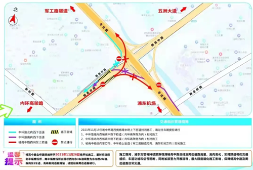 2021年11月26日(周五)夜间起,封闭中环立交杨高中路跨线桥北半幅(西向东3车道),跨线桥南半幅(东向西3车道)改为双向通行(西向东1车道、东向西2车道)。