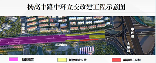 杨高中路(罗山路立交-中环立交)改建工程,西起云山路西侧K2+137,东至中环立交,全长1.7km,规划红线宽 50米,采用“主线连续跨线桥+地面道路”的形式,道路等级为城市主干路,主线规模为机动车双向6车道,地面道路规模为机动车双向4至6车道,两侧设非机动车道和人行道。主线上跨云山路、枣庄路(红枫路)后与金桥跨线桥相接,在枣庄路西侧设置一对上下匝道,东侧接入中环立交。
