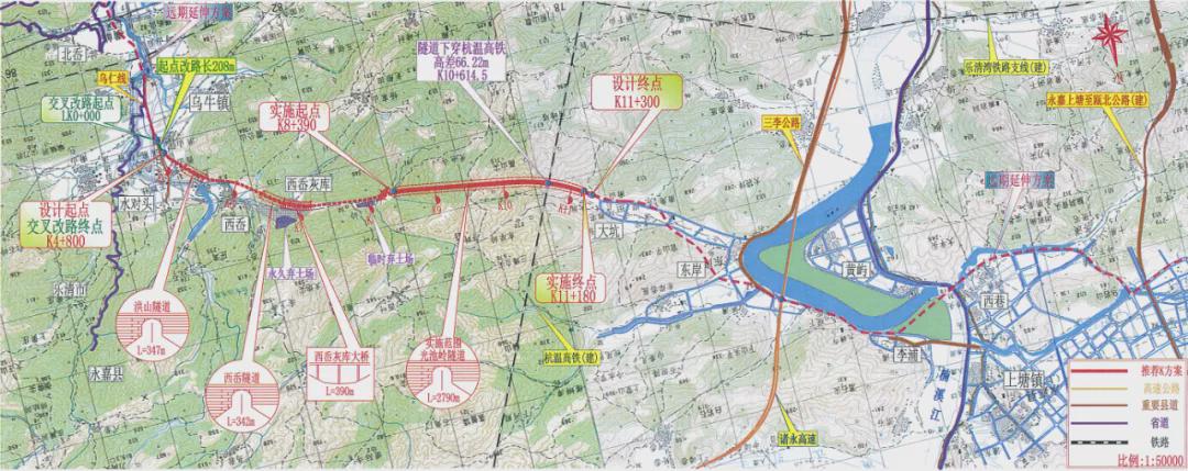 西岙至东岸隧道工程属于S325省道乌牛至上塘段工程的一期项目,位于上塘与乌牛交接处,起点位于乌牛街道西岙村,经光池岭隧道下穿杭温铁路立体交叉,终于南城街道东岸村。工程设光池岭分离式长隧道1座,双向四车道,全长约5.5公里,左洞2781米,右洞2790米,采用一级公路标准建设,同时也是杭温铁路开通前必须抓工期的控制性工程。建成后,将打通永嘉县南部地区的横向通道,对完善永嘉县区域路网结构、促进交通协调发展意义重大。