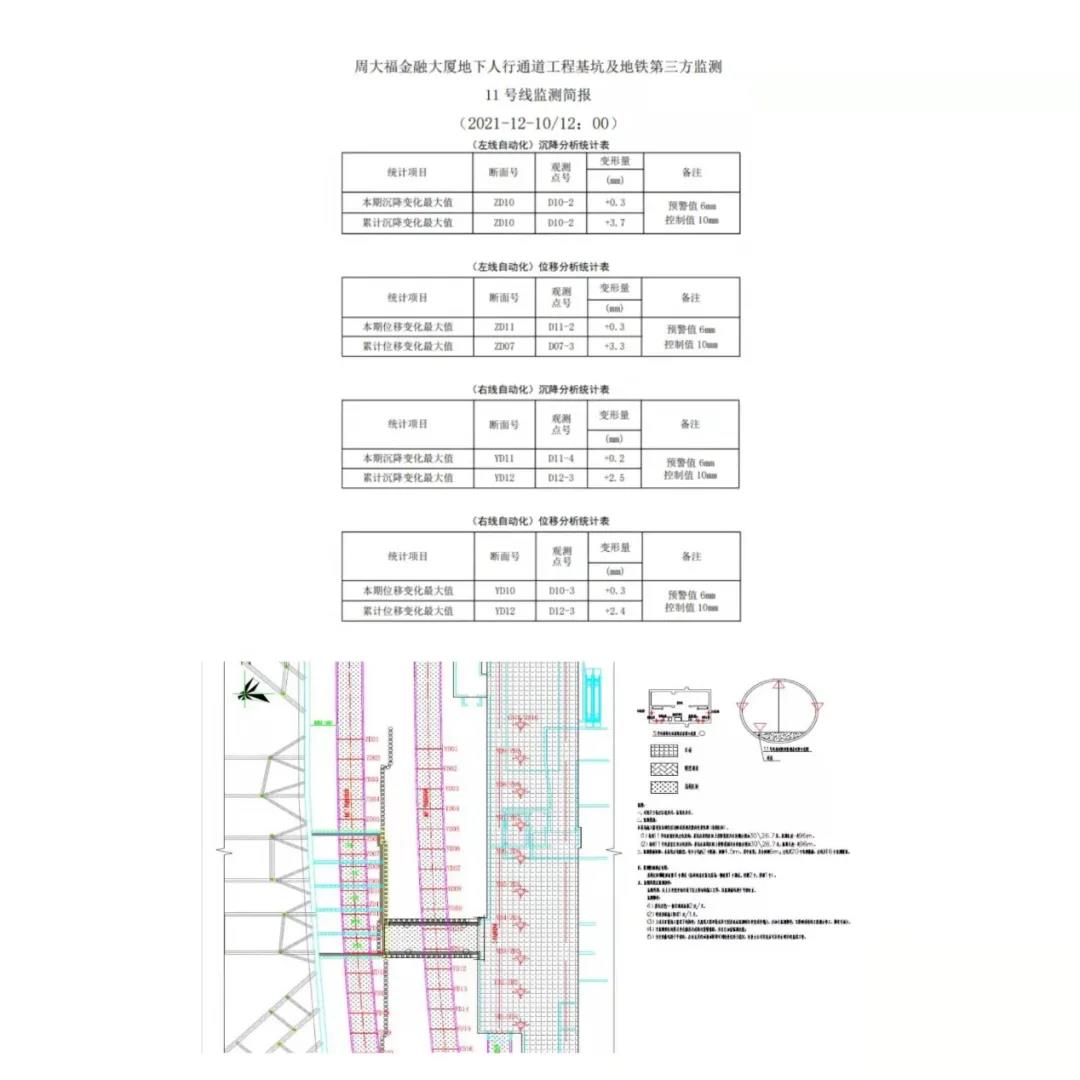 此项目位于听海大道西侧,连接地铁5号线南延线桂湾站。听海大道下方的通道已施工完毕,止于听海大道道路红线,听海大道已建成通车。坑底距离盾构管片顶距离约3.37~4.32m。MJS桩位距离地铁管片最近距离仅1m,由于地层为回填土,施工可能引起地内压力变动过大从而导致地铁管片隧道变形,因此必须严格监控地内压力,将施工对周边环境影响降至最低,此项目结束累计沉降+3.7mm,位移变形量+3.3mm,皆在预警值6mm以内,实现了邻近地铁微扰动施工。