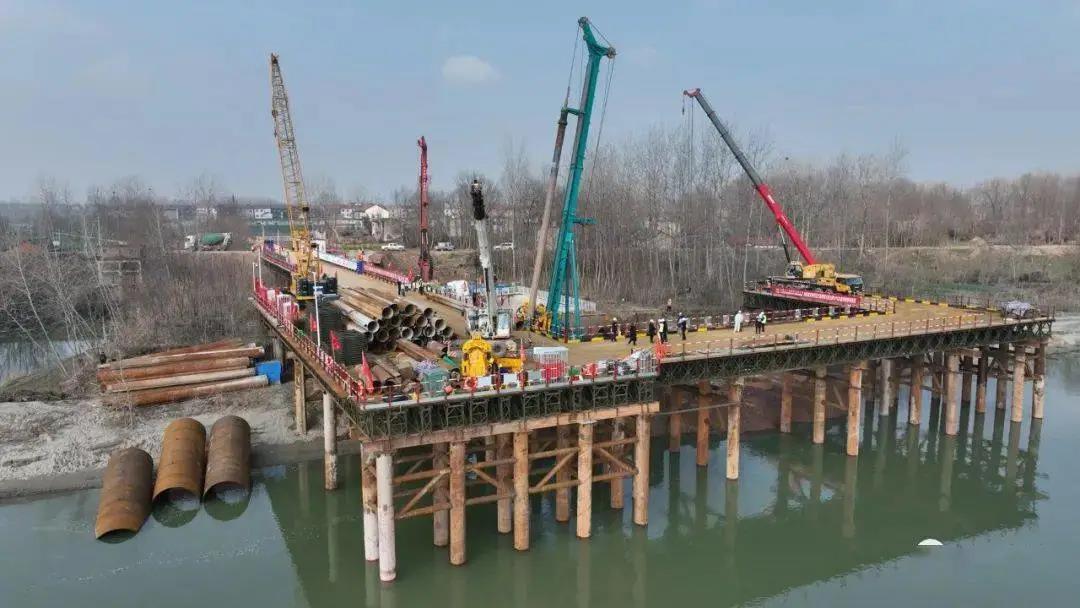 据了解,钟祥汉江铁路特大桥主桥317#主墩共有20根桩基,首次灌注的桩基直径 2.5m,桩长68m,灌注混凝土340方。面对主桥施工任务重、时间紧,沪渝蓉高铁武宜段5标项目部优化施工方案,借助枯水期,多开工作面,快速完成栈桥及钻孔平台搭设,化水上为陆地施工,节约工期一个半月。
