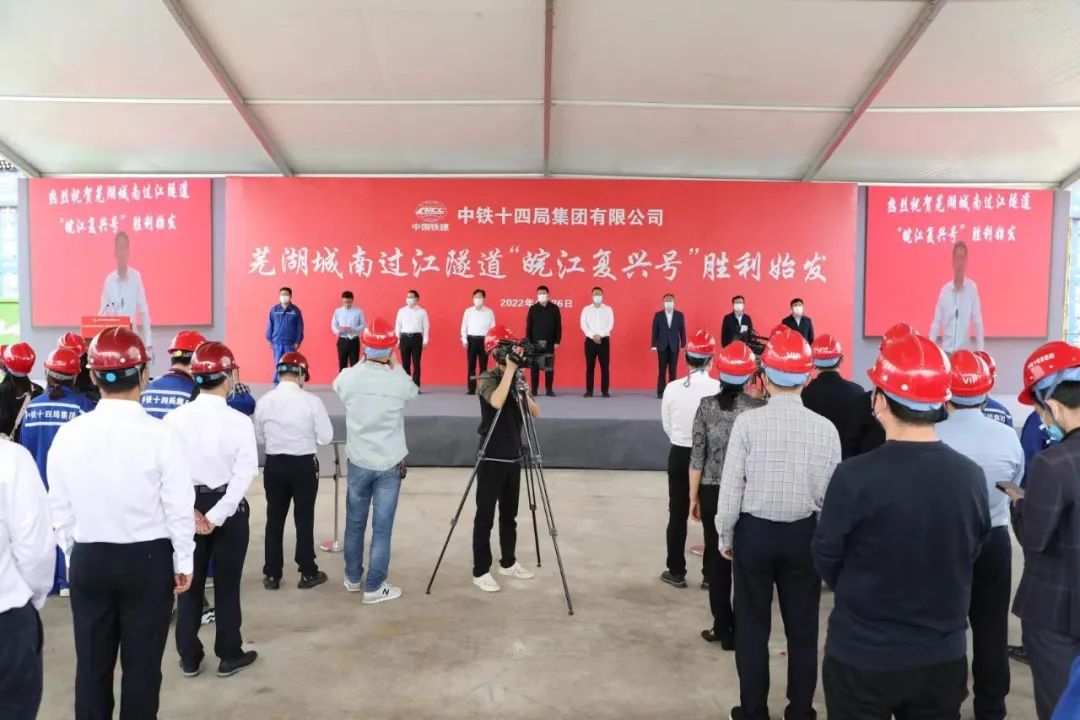 中铁十四局党委书记、董事长吴言坤致辞,他表示在抗击新冠疫情的关键时刻,芜湖城南过江隧道克服众多困难顺利始发,得益于芜湖市委、市政府的全力支持。 下一步中铁十四局将继续贯彻落实各方各项要求,加大资源投入,全力保障盾构掘进,努力为芜湖高质量发展作出更大贡献!