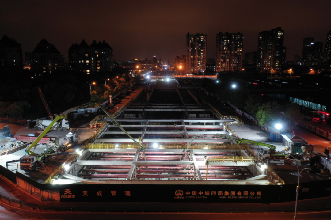 本次浇筑的底板设计方量为717m³,需采用不间断浇筑法一次浇筑成型。为确保浇筑任务顺利完成,中铁四局项目部针对施工特点提前编制技术方案交底及安全质量控制预案,并在现场严格落实施工方案,精心组织施工,相继克服隧道底板厚度大、一次性浇筑方量多、交叉施工风险高等困难,在确保安全质量可控的前提下,提前完成了全线主体结构底板的封底工作,为后续施工任务的开展提供有力保障。