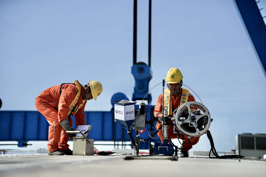 6月28日上午,建设者在进行最后一道焊缝的焊接作业