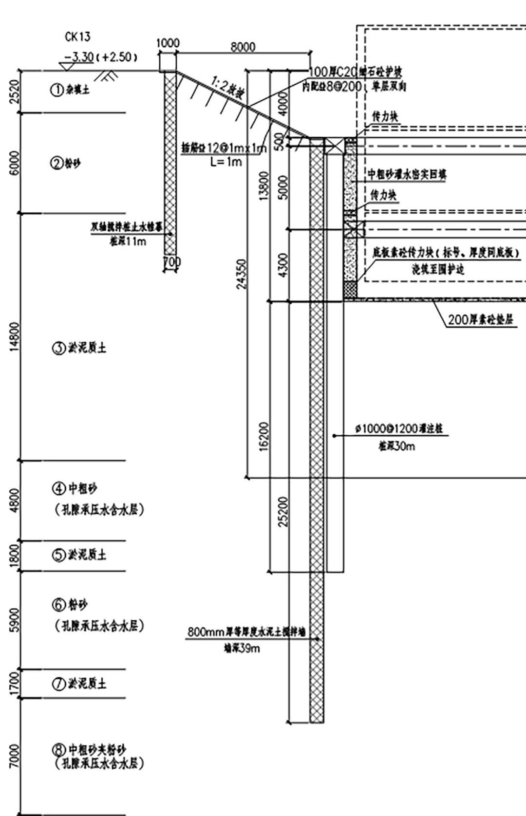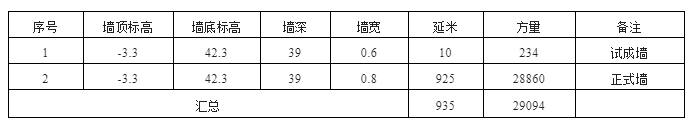(1) 厚度800mm,墙顶标高-3.3m,墙底标高-42.3m;
