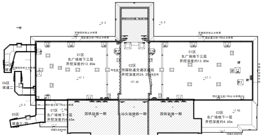 本工程(东广场C区)项目位于汕头市既有火车站以东区域,西侧紧邻拟建汕头高铁站站房,东侧为规划韶山路,北侧为规划站北路,南侧为规划站南路,其地下空间工程主要为地下三层,西侧城市管理车场及公交车停车场局部设置地下一层,中部预留轨道交通区间段,该区间段设置地下四层,随东广场大基坑一同开挖。