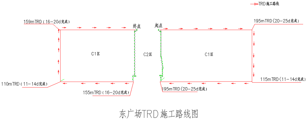 TRD工法设备采用顺时钟方向先由东侧中间自北向南施工,其次由东南角自东向西施工,再由西南角自南向北施工,再由西北角自西向东施工,最后由东北角自北向南施工,施工示意图如下: