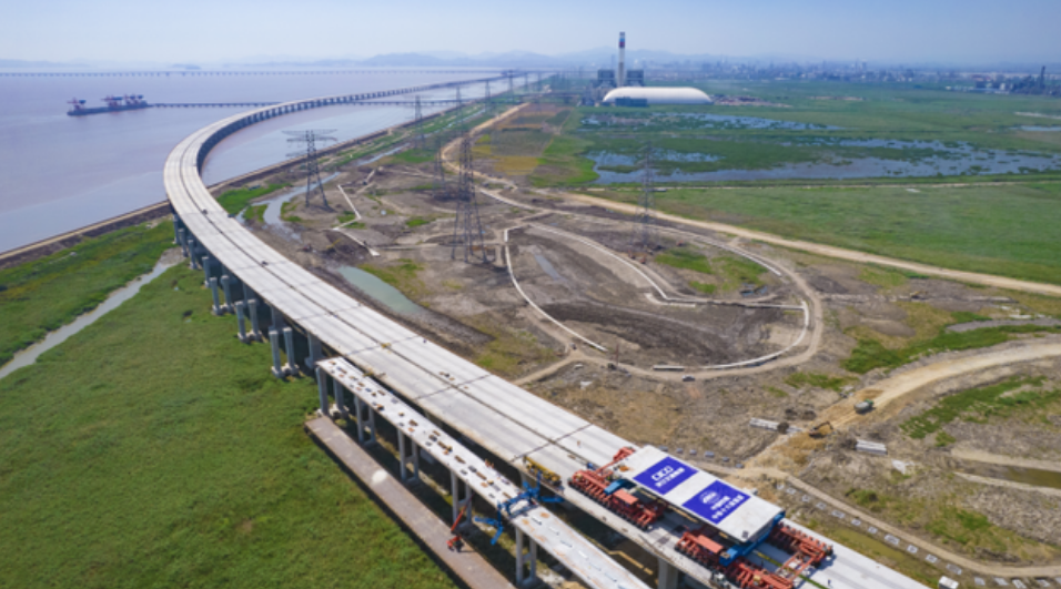 杭甬复线宁波一期项目由省交通集团牵头投资建设,其中滨海高架桥主要连接该项目的澥浦互通和滨海互通,桥长4.5千米,是该项目海域里程最长的高架桥。桥上架设有1800吨的整孔预制箱梁,是目前国内高速公路建设系统梁上运梁单体最重的整孔预制箱梁。