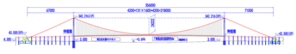 狮子洋通道主体工程路线起于南沙区大岗镇,接广中江高速公路,向东经东涌、黄阁镇,在沙仔岛与虎门港之间跨越珠江,向东经沙田镇,终点在东莞市虎门镇,接常虎高速公路虎门港支线一期,路线全长34.915公里。其中狮子洋大桥主跨跨径布置为2180m,南沙侧边跨跨径为670m,东莞侧边跨跨径为710m;上下层均为双向8车道高速公路,采用门式塔,塔高约330m。承台采用哑铃形,基础采用桩基础,锚碇采用重力式锚碇。