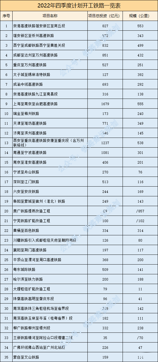 2022年四季度,据不完全统计,将有30余个铁路项目进入全面开工阶段,(新建)总里程超7000公里,总投资约1.5万亿。