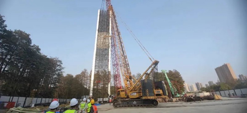施工准备阶段,12号线工程项目部积极协调处理,克服周边环境条件复杂的困难,确保材料设备及时运至现场。由于地连墙钢筋笼较长,大吨位钢筋笼吊装风险高、难度大,项目部组织专家对施工方案进行论证,严格把控各道工序,在正式起吊前对起吊负荷、起吊设备、吊点位置等进行准确复核,顺利完成了首幅地连墙钢筋笼入槽。