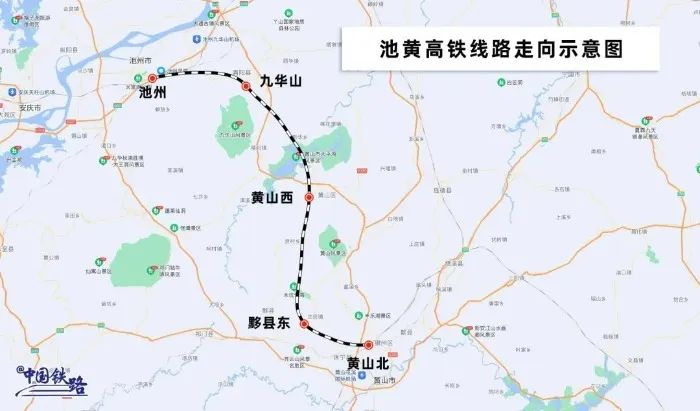 池黄高铁位于安徽省南部,线路起自池州市,终至黄山市,全长约125公里,设计时速350公里,沿线设池州、九华山、黄山西、黟县东、黄山北5座车站。