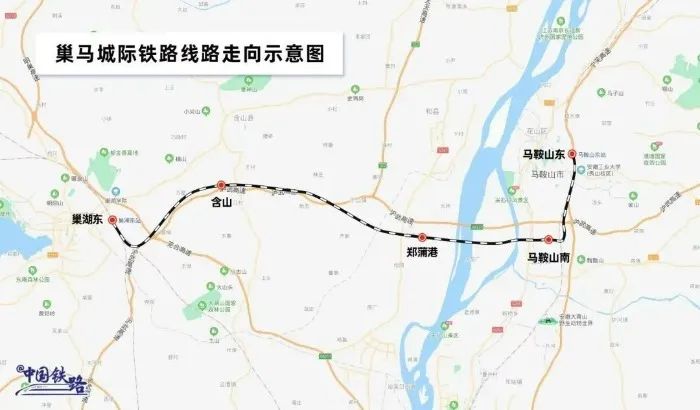巢马城际铁路正线全长61公里,设计时速350公里,其中江北段新建正线约47公里。线路起自合杭高铁巢湖东站,终至马鞍山东站,沿线设巢湖东、含山、郑蒲港、马鞍山南、马鞍山东5座车站。巢马城际铁路分长江以北、以南两段推进建设,江南段(含马鞍山长江公铁大桥)已于2021年5月正式开工。