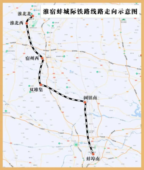 淮宿蚌城际铁路位于皖北地区,线路自淮萧客车联络线淮北北站引出,向南经淮北、宿州、蚌埠三市,引入蚌埠南站,新建正线长度162公里,设计时速350公里,沿线设淮北北、淮北西、宿州西、双堆集、固镇南、蚌埠南6座车站,其中淮北北站、蚌埠南站为既有车站。其中,蚌埠北特大桥全长24.3公里,跨越京沪铁路、怀洪新河,是淮宿蚌城际铁路重点工程之一。