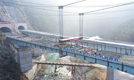 “考虑到大桥特殊的地理环境,施工团队研发了国内首创的缆索吊装悬拼安装工艺。”据施工方中国五冶集团项目钢结构技术负责人黄治铭介绍,他们将大桥分成94节不同节段,采用单组60吨、双组85吨的缆索吊解决垂直与水平运输难题,运用悬挑法对称拼装,实现20万套螺栓的100%穿孔,成功完成大桥共计5525吨钢结构的安装任务。