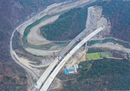 全长约245公里的九绵高速公路起于九寨沟甘川界青龙桥,止于绵阳市游仙区张家坪,总投资超400亿元。全线共打通隧道44座,架设桥梁129座,桥隧比高达83.6%。全线建成通车后,成都至九寨沟的车程将由目前的8个小时缩短至4个小时。九绵高速桂溪大桥位于绵阳市北川县桂溪镇,是九绵高速公路的重要节点,大桥地处平通河裂腹鱼类国家级水产种质资源保护区的核心区内,最大跨度达110米。