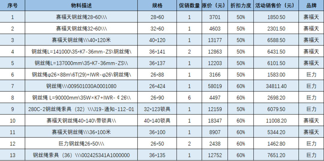 配件促销:赛福天钢丝绳/巨力钢丝绳