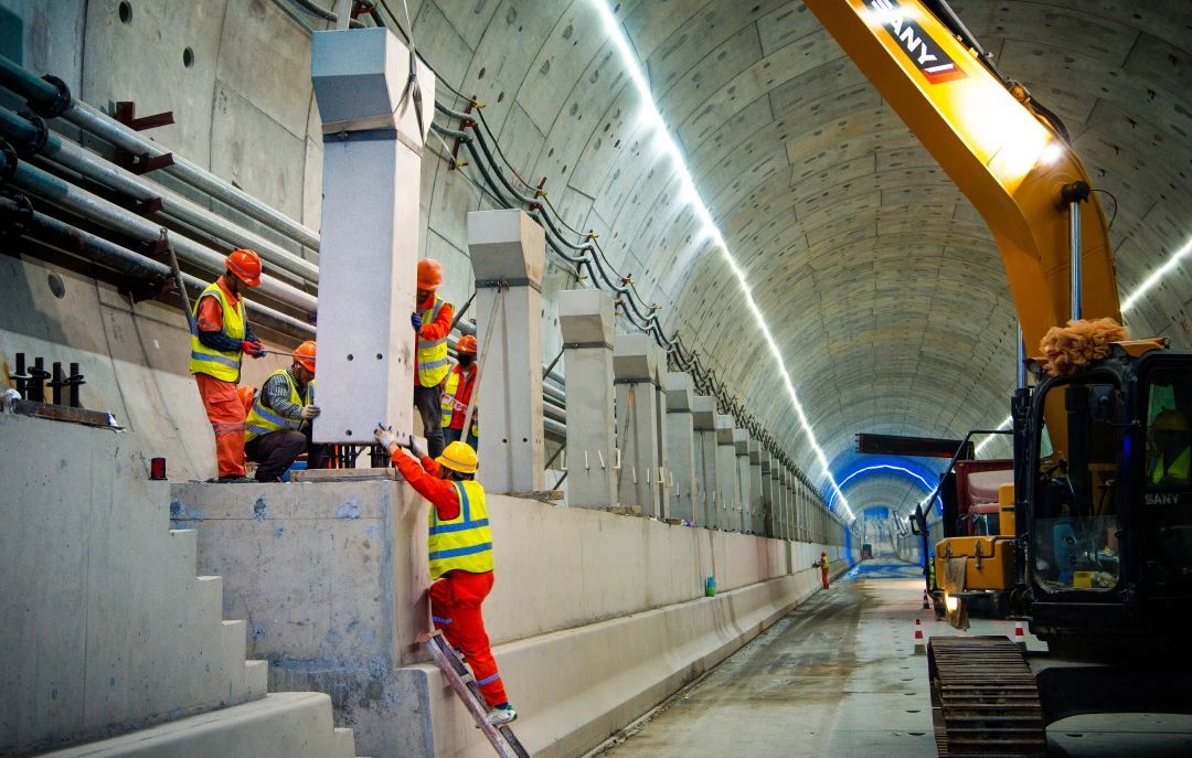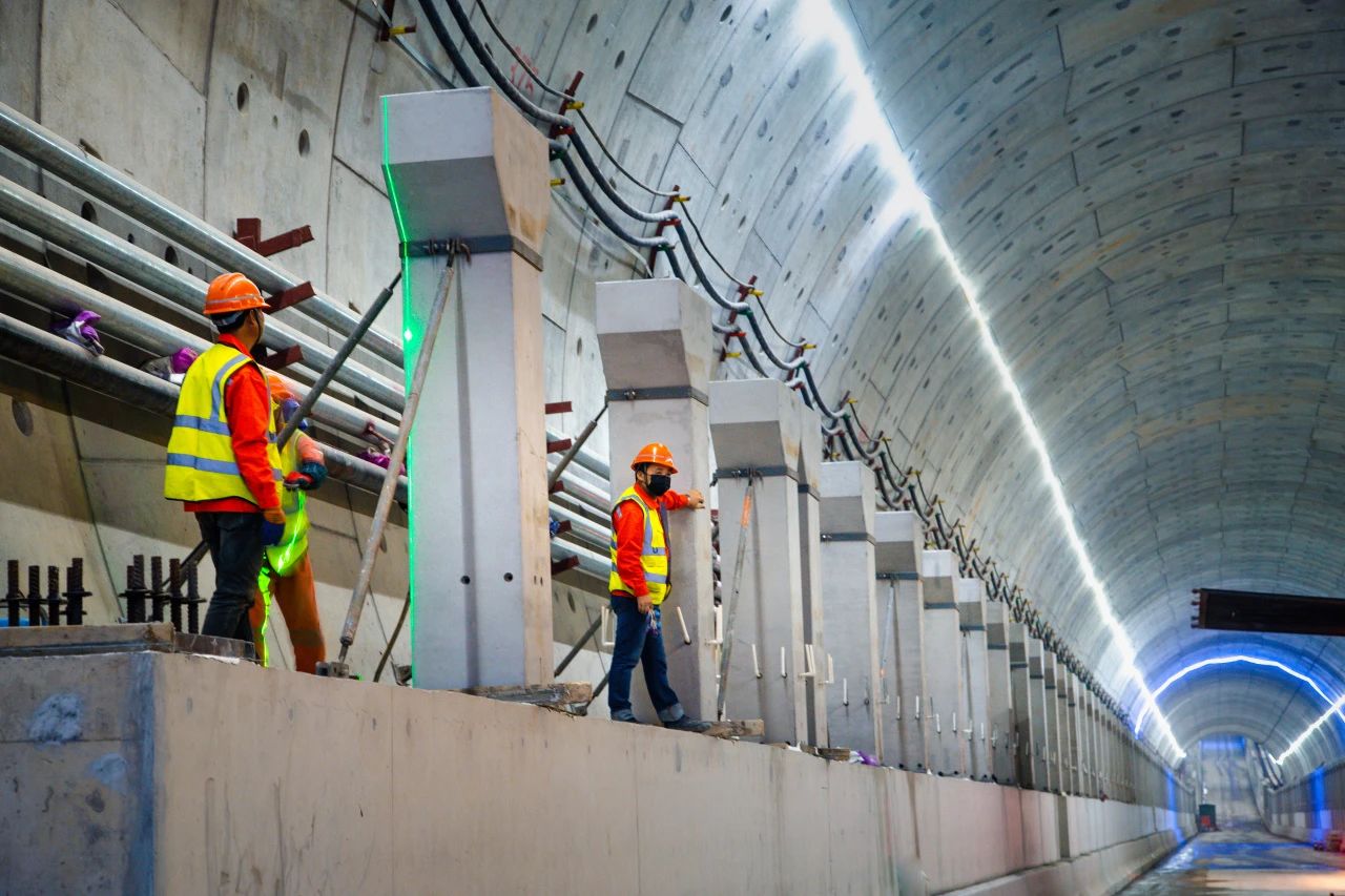 银都路隧道内部结构采用全预制及装配式施工。作业人员将预制厂内生产完成的隧道构件,如同“搭积木”般进行拼装。新技术在提高建筑构件的质量和施工效率的同时,减少了60%人工投入,并有效降低了施工产生的噪声、振动、粉尘等,让隧道建造更为安全、绿色、高效。此外,装配式技术也有效推动了产业工人专业化转型,为企业进一步优化工人队伍结构、推进企业改革转型提供助力。
