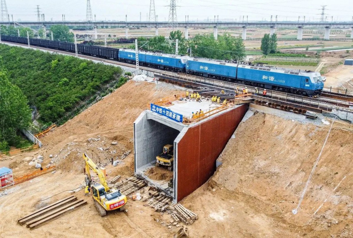 在下穿瓦日铁路施工中,建设者先将预制好的框架桥置于瓦日铁路路基处,利用12台400吨顶镐在6天内顶进42米,在不影响瓦日铁路运行的情况下“梁换柱”,将框架桥嵌入瓦日铁路路基。同时,建设者采用横抬纵挑线路加固工艺对瓦日线路进行加固,在现场设置防护桩、支撑桩和抗移桩有效保护瓦日线路基边坡、防止线路横移,最终“零沉降”完成了这一国内罕见的货运铁路下穿万吨级重载铁路施工。