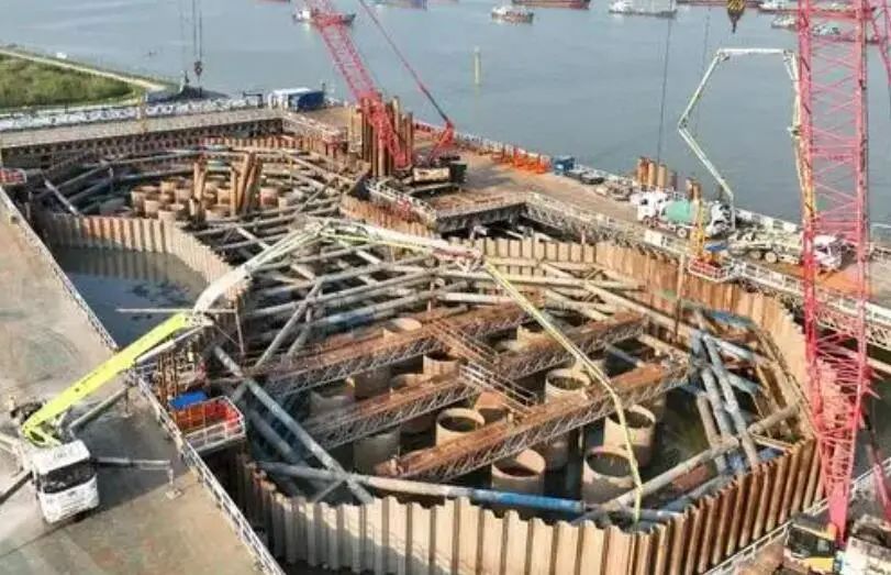 狮子洋大桥西索塔承台采用分离式设计,单侧承台平面为圆形,高9米、直径40米,承台施工基坑支护采用钢板桩围堰结构形式,将深插河床70米的桩基与高342米塔柱连接在一起,是大桥重要的受力结构之一。此次施工的封底混凝土厚度2.5米,采用水下C25混凝土,总浇筑量约8637立方米。在水下混凝土浇筑过程中,泵车泵送至料斗中然后通过导管输送至围堰基底,由于混凝土体量大,浇筑面积大,为便于施工组织,混凝土分左右幅浇筑。
