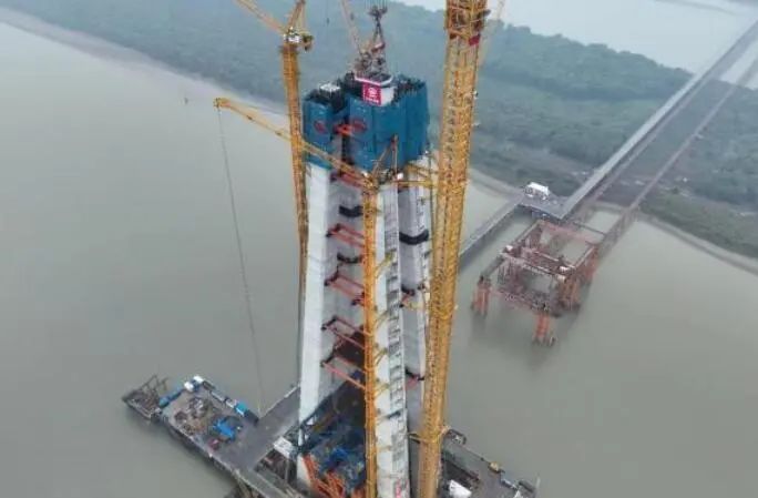据介绍,马鞍山长江公铁两用大桥主桥采用主跨(2×1120)米三塔钢桁梁斜拉桥,总长3248米,是目前世界上首座双主跨超千米的三塔斜拉桥。在三座主塔中,Z3号、Z5号墩为边塔,塔高分别为308米和306米;Z4号墩为中塔,是全桥最高塔,塔高345.6米,采用四肢空间结构,工程量相当于Z3号、Z5号墩边塔的总和,是全桥关键控制性工程。主塔均采用钢混组合结构,主塔拉索锚固区(上塔柱)采用钢塔形式。Z4号墩混凝土结构高223.5米,钢塔总高121.5米,共分为39个节段进行吊装,最重吊装单元458吨。本次吊装的首节钢塔高7.5米,重262吨。