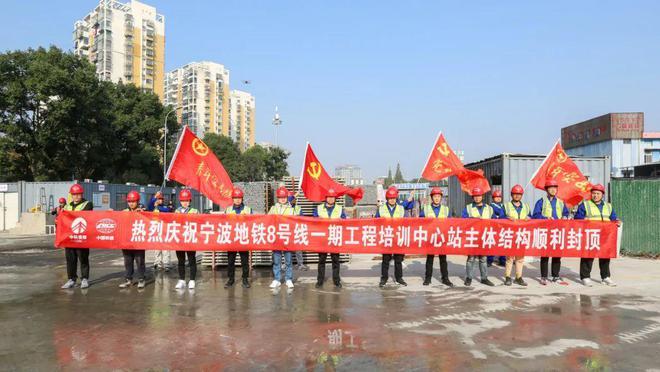 宁波轨道交通8号线一期工程(姜村站—江北大道站)是宁波市东南至西北方向的市区线,全长23.3公里。市政公司负责施工的TJ8103标施工内容涵盖两座车站,其中旧宅徐站已于今年7月份实现主体结构封顶,此次封顶的培训中心站为地下二层11米岛式站台车站,车站总长为299.6米,宽度为18.3米,标准段底板埋深约为16.3米,采用盖板下明挖顺作法施工。