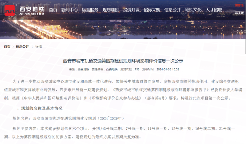 1月3日,西安地铁官网发布《西安市城市轨道交通第四期建设规划环境影响评价信息一次公示》。《西安市城市轨道交通第四期建设规划社会稳定风险分析调查公众参与公示》。根据公示,西安地铁四期规划包含六个项目,3号线二期、7号线一期、11号线一期、12号线一期、16号线二期、21号线一期。