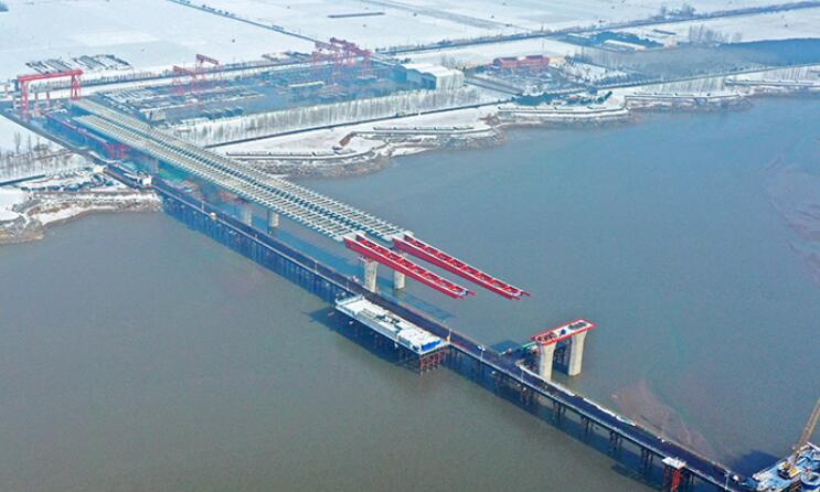 2024年1月17日,河南省重点工程沁伊高速孟州黄河特大桥项目建设工地,施工单位正在加紧施工。