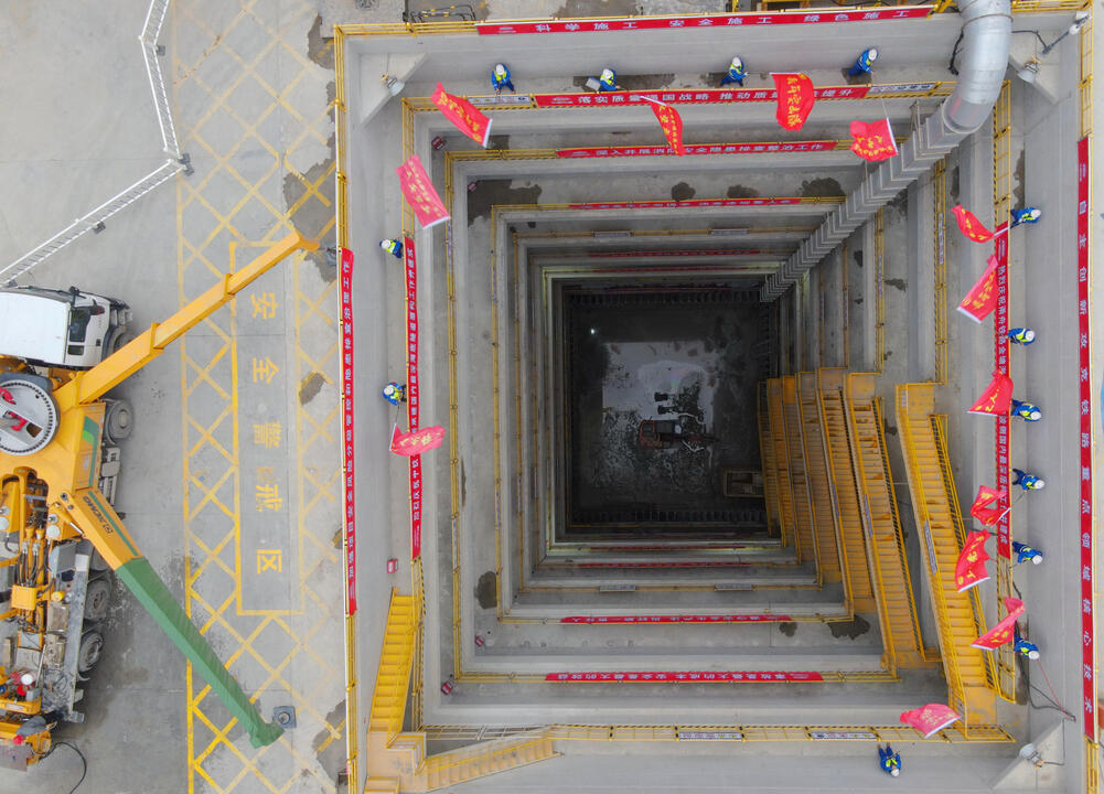 在施工工法上,创新使用“切豆腐”作业方式,通过先分块后开挖的工法提高开挖工效。在全体参建人员的努力下,历时8个月,圆满完成超深基坑开挖和混凝土结构封闭工序,打造了‘内实外美、不渗不漏’的超深工作井,为后续盾构机组装和始发提供了必要条件。