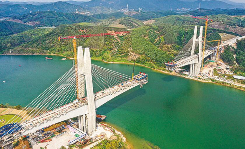 2 月 21日拍摄的南深高铁南玉段六律邕江特大桥建设现场。新华社记者陆波岸摄