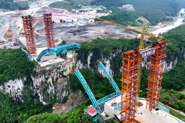 在贵平高速T18标拉密河特大桥项目施工现场,工人们正在对今天吊装的拱肋进行安全加固、加装安全操作吊架。拉密河特大桥左右幅共8个拱肋节段,其钢管拱肋吊装是该工程的关键部分,起重质量大、起吊荡移角度大、索鞍滑道横移摩擦系数大,是重难点工程之一。